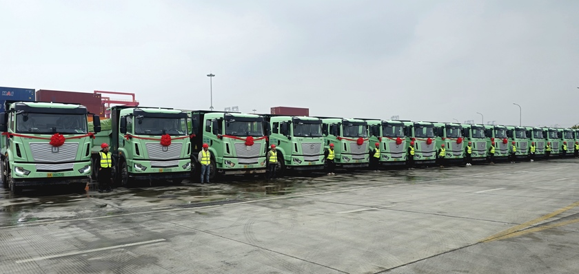 10點18分,城發(fā)物產(chǎn)公司純電新能源渣土車隊從下沙港9#泊位渣土碼頭緩緩駛出,前往上城區(qū)開展第一次渣土運輸任務,純電新能源渣土車正式投運,為市渣土消納行業(yè)綠色發(fā)展注入了新動力。