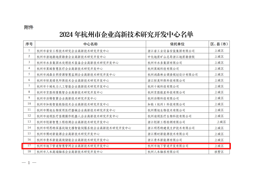 近日,杭州市科學(xué)技術(shù)局發(fā)布《杭州市科學(xué)技術(shù)局關(guān)于認(rèn)定2024年杭州市企業(yè)高新技術(shù)研究開(kāi)發(fā)中心的通知》,集團(tuán)申報(bào)的杭州市地下管道智慧管網(wǎng)企業(yè)高新技術(shù)研究開(kāi)發(fā)中心位列其中,正式獲批!